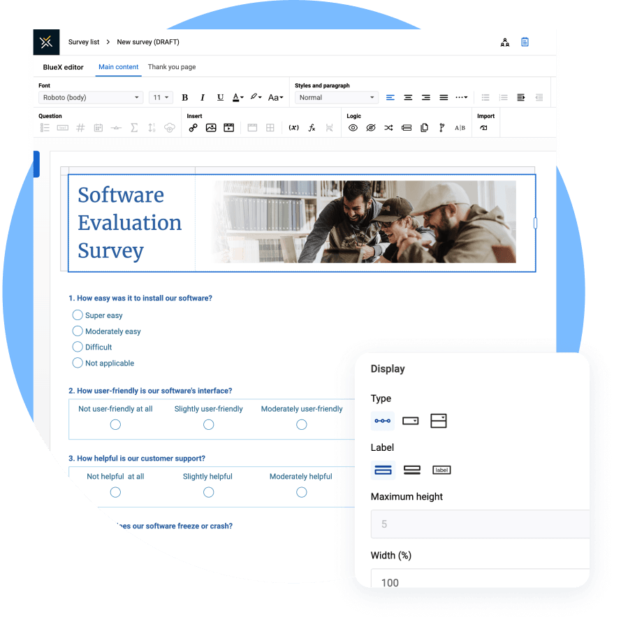 - Conditional branching, skip logic, and dynamic rules, all built visually