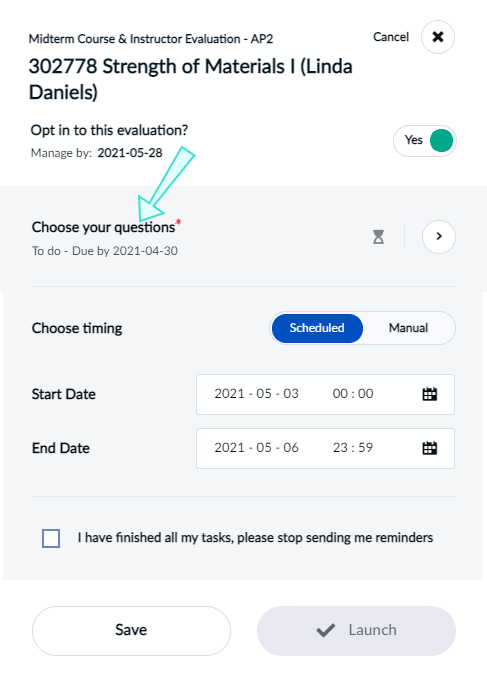 In order to launch a Pending evaluation, it is mandatory that you choose and submit course questions, and set a start and end date if not already configured.