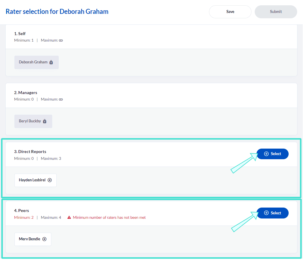 - Select the raters for each group by checking the box next to their name. Note: If the check box is grayed out, it means the rater has already been invited to another group and cannot be selected.