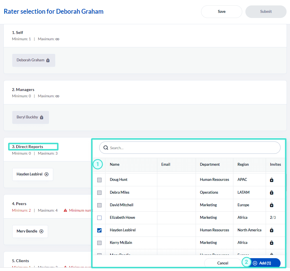 Group members with an Add option next to them are typically members found outside of your organization. To include them in the evaluation, you must provide their first name, last name, and email address. For example, a ‘Clients’ group could be invited to participate, and you would need to manually add these members as raters.