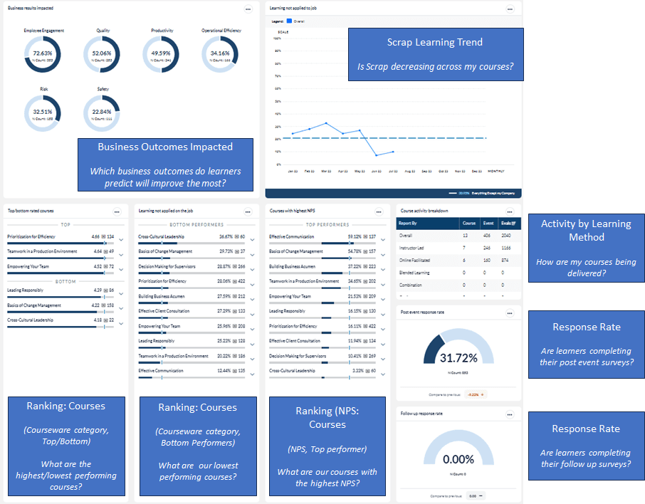 This dashboard provides insights into key metrics, top and bottom rated courses, classes, and instructors during a selected time period, areas of success and drivers behind performance gaps. Using this template can help you answer questions such as: