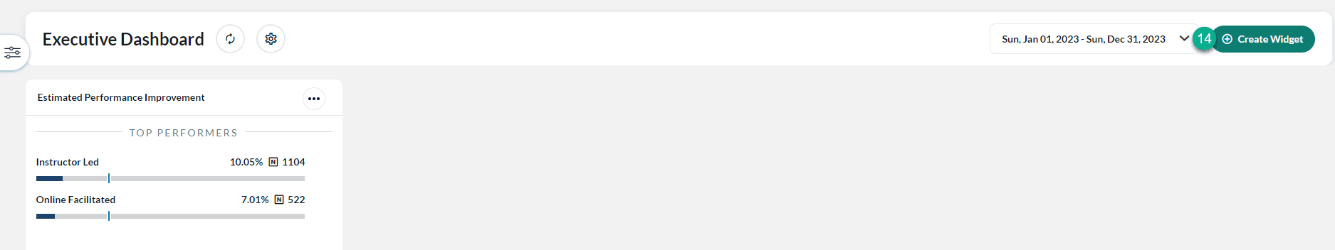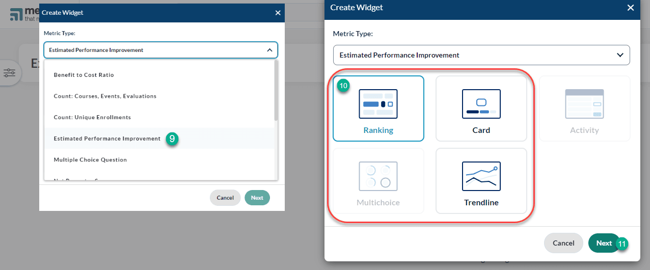 - Each Metric Type is associated with specific visual displays which will be highlighted in the pop-up window. In this example, the visual displays available for Estimated Performance Improvement are Ranking, Card and Trend. Select one of the highlighted widget.