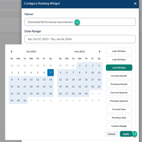 - In the Configure widget pop-up window, review and set each filter. For example, by clicking on the Date Range, you can select to display Last 30, 60 or 90 days, months, quarters or a custom date range of data.