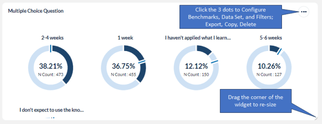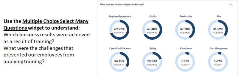 The Multichoice widget will display results for your multiple choice questions, including questions related to business results, barriers to impact, or any custom multiple choice questions you have on your surveys. Use this widget to validate whether training impacted the intended business results, what percentage of job impact was realized from training, and what prevented learners from applying training on the job.