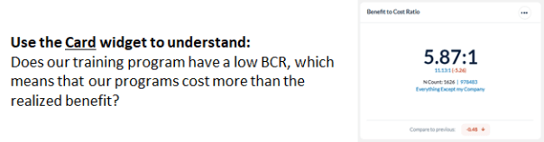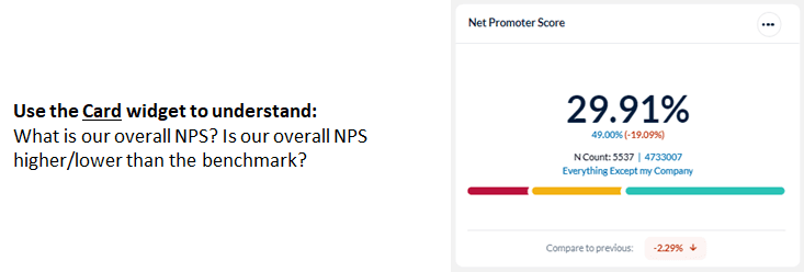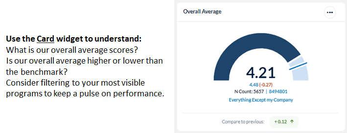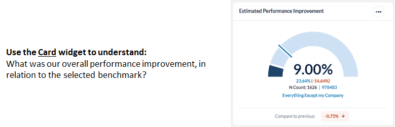 Card widgets present the overall score for the selected metric, with a benchmark comparison, in an easy-to read, simple display. Only one benchmark can be applied to a Card widget.