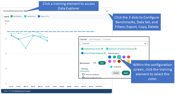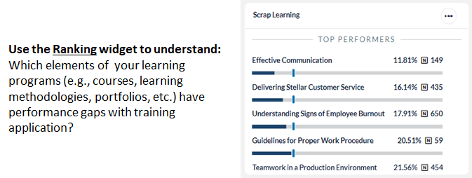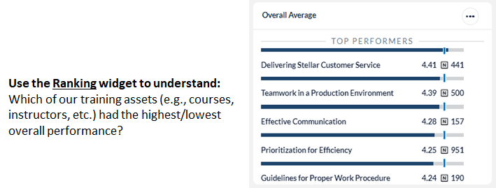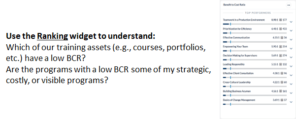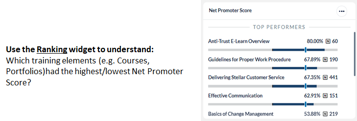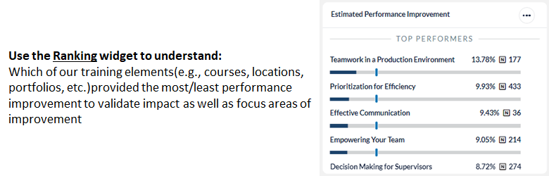 | Configuration | • Rename widget (Best practice! Rename your widgets to reflect the data contained within) • Modify Display Options (Ranking Widget) • Select training elements to Report By • Configure Primary and Secondary Benchmarks |
