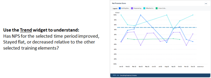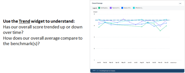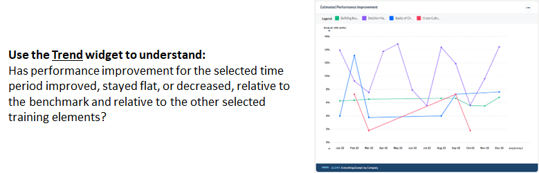 Trend widgets will display up to 10 training elements, trended over time, and compared against one or two benchmarks. Using the Trend widget, you can view your results for the last completed 6 months or the last completed 12 months, relative to the time frame configured for the Dashboard. For example, if today is September 20th, and your Dashboard is configured to display data from July – September of 2018, you can view a trend line for the previous 6 or 12 completed months, which would include data from March – August (the last fully completed month). As of October 1st, your 6-month trend would display data from April – September.