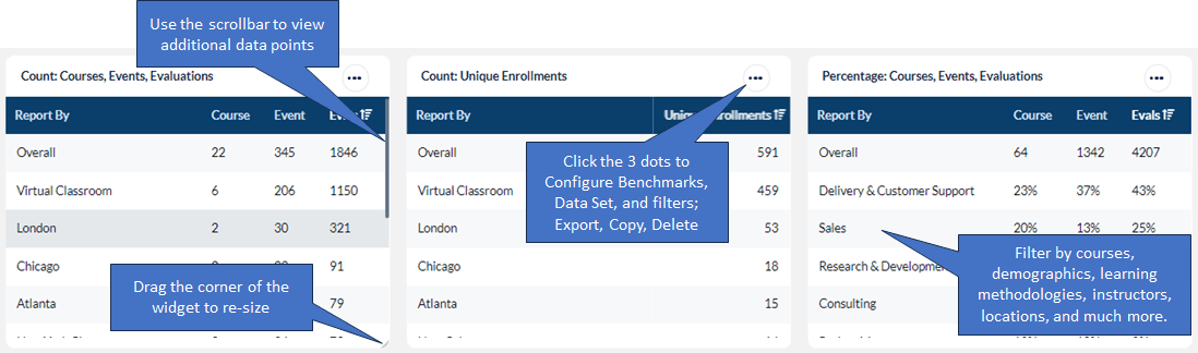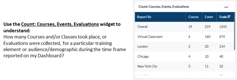 - Count: Courses, Events, Evaluations widgets will display the number of courses, events and evaluations submitted for the selected training element or audience/demographics during the time frame selected.