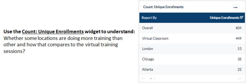 - Count: Unique Enrollments widgets will display the unique enrollments for the selected training element or audience/demographics during the time frame selected.