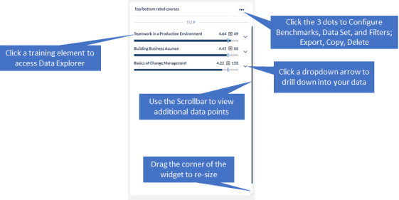 - Drill-down into individual training elements within the widget (ex: click on the down arrow next to the Course Name to view individual Class data)