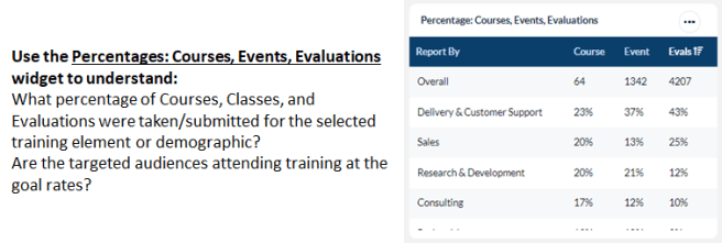 - Percentage: Courses, Events, Evaluations widgets will display the percentage of courses, events and evaluations submitted for the selected training element or audience/demographics during the time frame selected.
