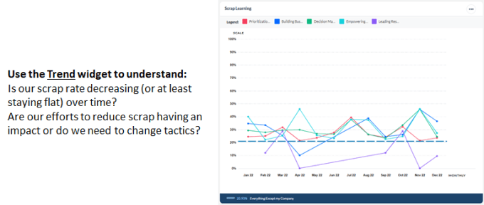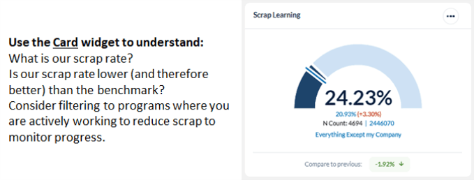 The Scrap Learning dashboard widget provides a summary view of the current scrap rate for a defined dataset, compared to a benchmark of your choice. The widget also provides insight into the question categories or courses which are driving the scrap rate, based on proprietary algorithms built into the MTM tool.