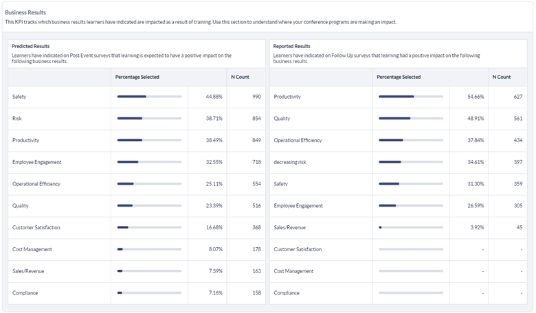 The first section of the Executive Summary Report provides insights into the Business Results impacted by training. These metrics indicate the level of alignment between business objectives and the learning experience. In the Predicted Results data set, the percentage of learners who indicated specific business results impact from training on the Post Event surveys will be displayed. In the Reported Results data set, the percentage of learners who indicated specific business results impact from training on the Follow Up surveys will be displayed.