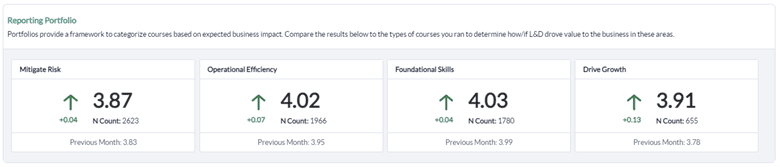 The data will display time period/time period changes based on the overall average scores for that individual portfolio. For example, if you ran the report for last month’s worth of data, each Portfolio would display the overall average change from the previous month to last month (e.g. the change from March to April). If you ran the report for last year’s worth of data (e.g. 2021), you would see the overall change from the previous year to last year (e.g. the change from 2021 to 2020), based on average scores for that entire Portfolio of courses. This will allow you to gauge whether your individual measurement Portfolios are meeting expectations for performance and make adjustments where/if necessary.