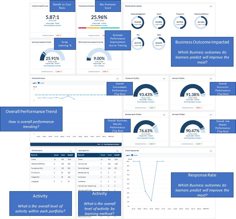 This dashboard answers business questions about your learning programs and provide insights into the impact and value of learning to stakeholders.Key Metrics and business results are collected from Post Event, Follow Up and Manager Surveys and provide recommendations for continuous improvement. Monitoring these metrics will help answer questions such as: