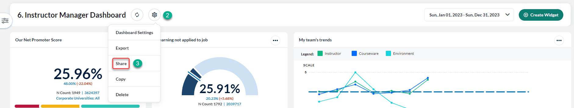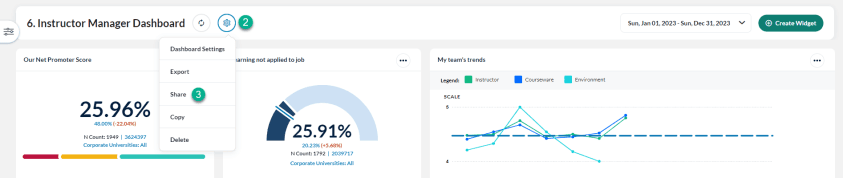 - An Instructor Manager has created a dashboard to share course delivery and business impact results with a team of instructors by accessing the Share Dashboard with other users option to select instructors. In this option, each instructor will only see their own data, even though the Instructor Manager’s dashboard contains data for the entire team.