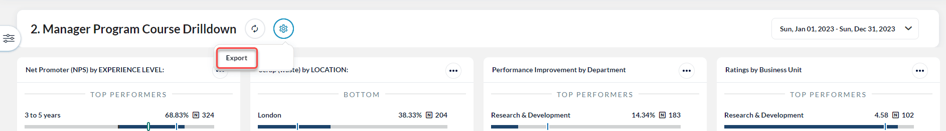 - Limit access to the Share by email option to only trustworthy users, reducing the overall risk of sharing organizational data. Contact your Explorance Customer Success Manager or support@explorance.com to set up this feature for those users who will be allowed to share dashboards by email.